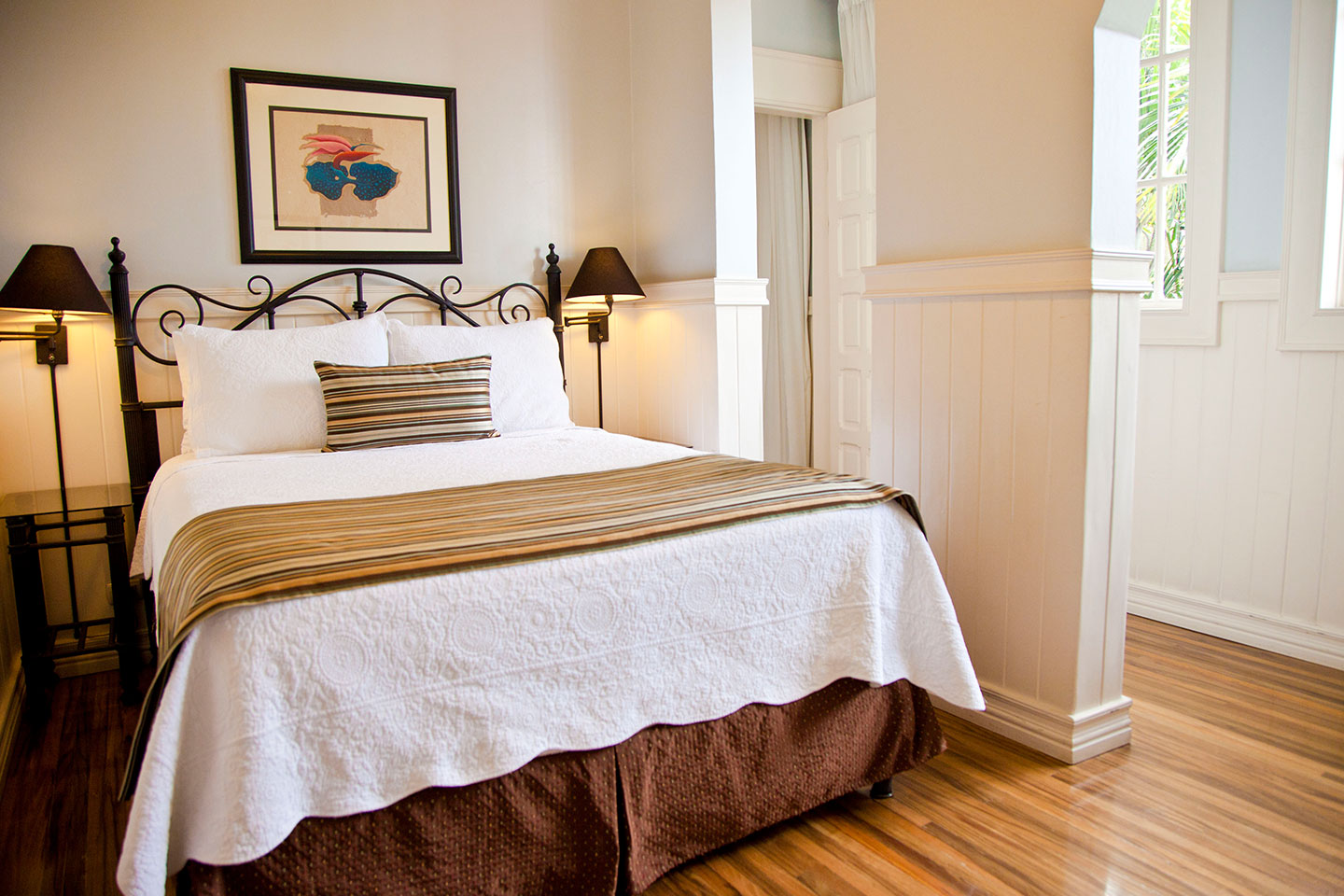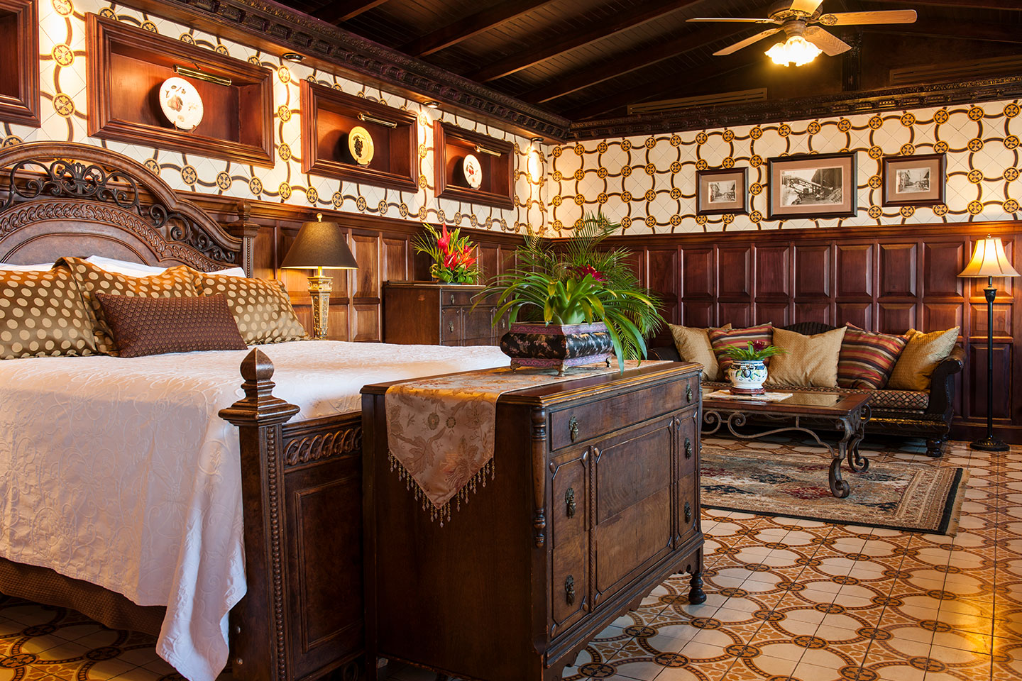 Step through an arched doorway into this dreamlike suite, where time seems to stand still. Once the grand living room of the mansion, today it boasts a private tropical garden, a spacious sitting area, two flat-screen TVs, and a luxurious king-size bed. A perfect retreat for those seeking privacy and tranquility.