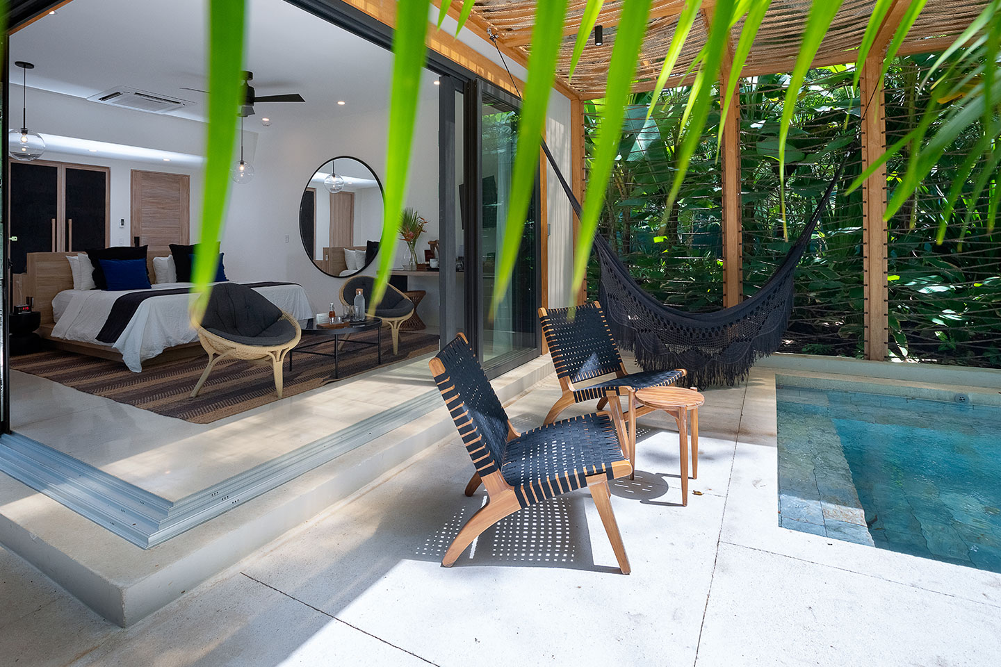 “Ninta” is the Chorotegan word for “beach”, and the inspiration behind our sleek units designed to make your beachfront experience as vivid as possible. The Ninta bungalows are made up of 80 square meters (800 square feet) of luxury space including an ample terrace, a private 3.5 x 3.5 meter (10 x 10 ft) plunge pool, hammock, king bed and double indoor/outdoor shower. Our floor to ceiling glass doors open to ocean views, making Ninta ideal for a memorable honeymoon or just a romantic getaway surrounded by raw nature and the hypnotic sound of the ocean.